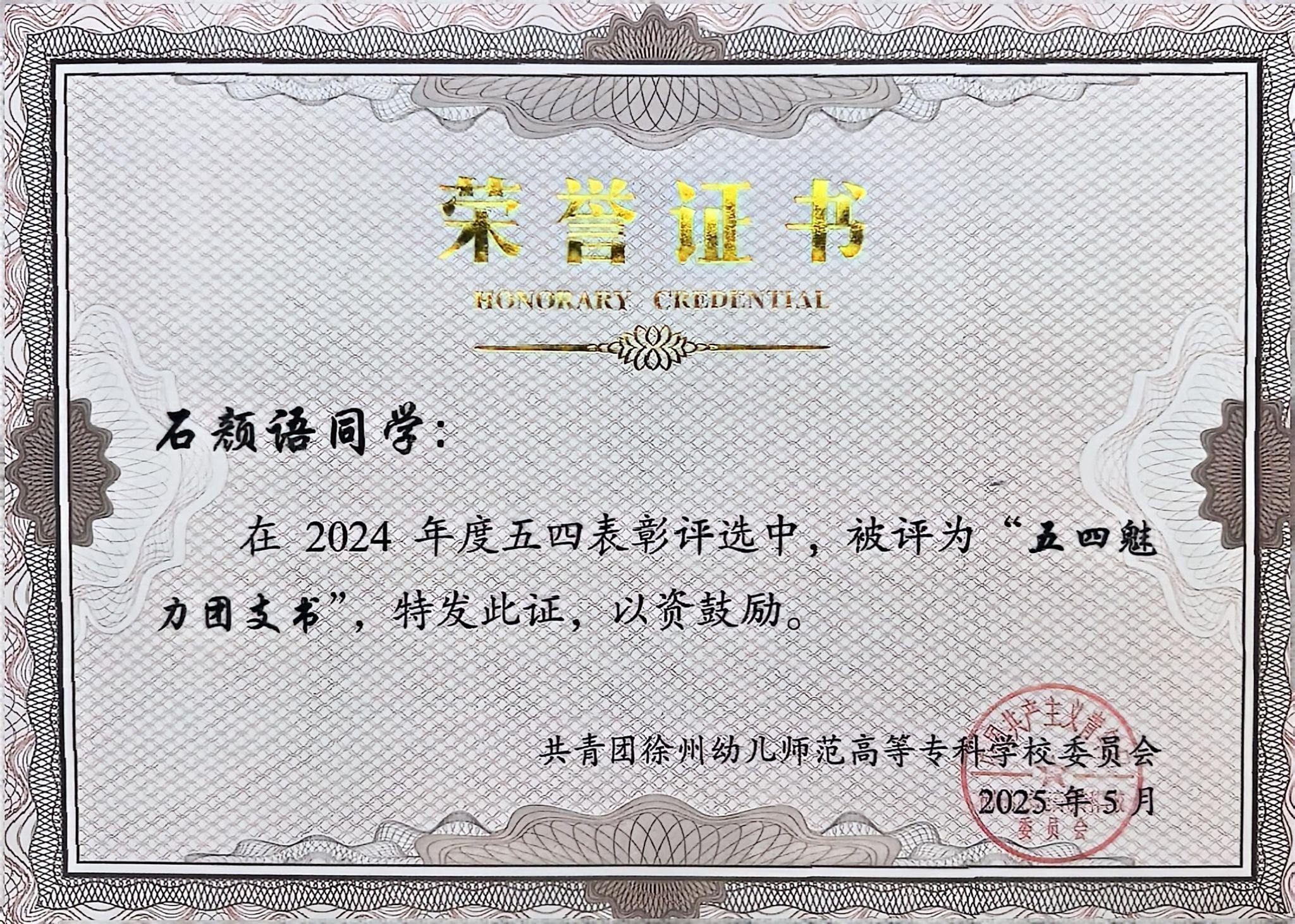 石颜语同学(团支部书记)获评“五四魅力团支书”称号。她以高度的责任感带领支部成员推进团务工作,策划多场特色团日活动,有效提升了支部的凝聚力和影响力。
