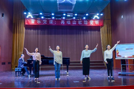 10月11日下午,公司党总支再唱山歌给党听——新生开学第一课专题音乐党课在校音乐厅开讲。本次音乐党课由公司党总支第一党支部书记孙玉柱教授主讲。公司党总支书记丰娴静,副书记李艳萍,副经理闫兵及全体23级新生和党员教师参加。活动由丰娴静主持,这场沉浸式音乐党课让全场师生全情投入、热血沸腾。
